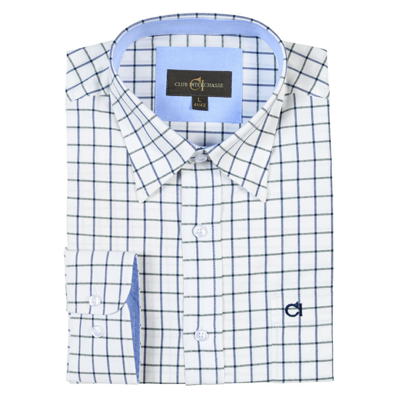 Toutes nos chemises sont livrées avec un bandeau à lemblème de Club Interchasse. Liserets des carreaux vert et bleu.